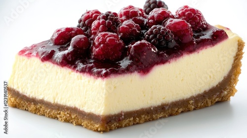 Delicious cheesecake slice topped with fresh berries and vibrant berry sauce at a dessert table. Generative AI