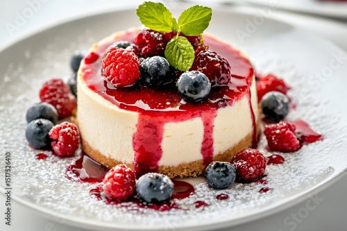 Delicious cheesecake topped with mixed berries and drizzled with berry sauce.