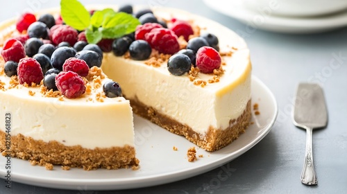 Delicious Cheesecake With Fresh Raspberries And Blueberries On White Plate : Generative AI