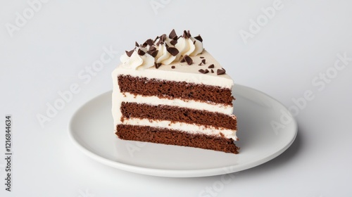 Delicious chocolate cake slice with creamy frosting and chocolate shavings on a plate