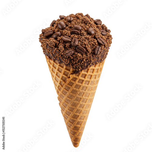Delicious chocolate coffee ice cream cone topped with coffee beans against a plain background