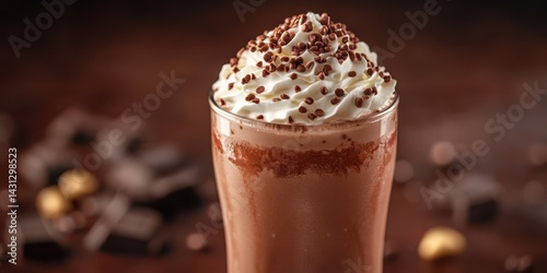 Delicious chocolate milkshake topped with whipped cream and chocolate sprinkles in a cozy cafe setting
