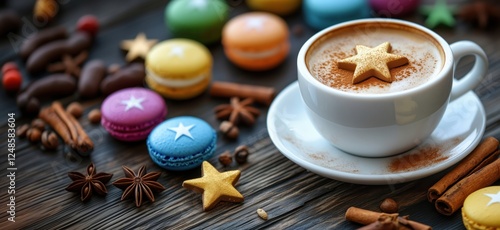 Delicious coffee with star-shaped cookie surrounded by colorful macarons and spices, copy space for text
