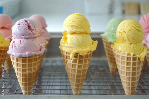 Delicious colorful ice cream scoops melting on waffle cones, creating a sweet summer treat