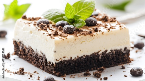Delicious creamy dessert slice with chocolate base and mint garnish plated elegantly for food photography : Generative AI