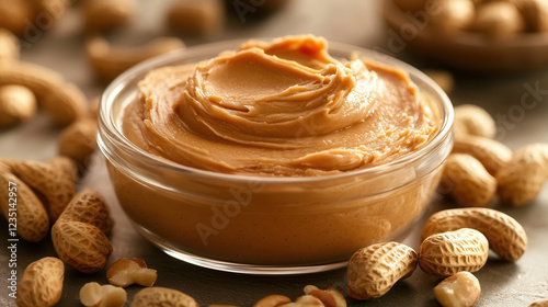 Delicious creamy peanut butter in a glass bowl with scattered raw peanuts on a rustic table