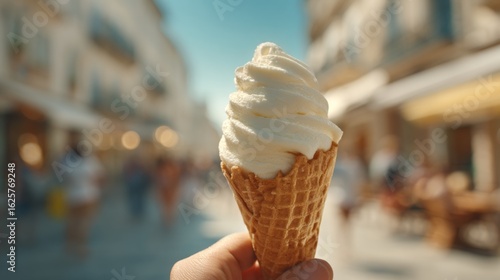 Delicious creamy soft serve ice cream cone held in hand with blurred street background and sunlight illuminating the scene