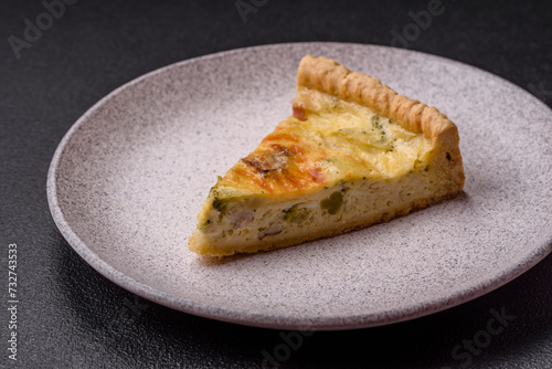 Delicious crispy quiche cut into slices with cheese, broccoli, tomatoes