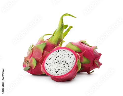 Delicious cut and whole dragon fruits (pitahaya) on white background
