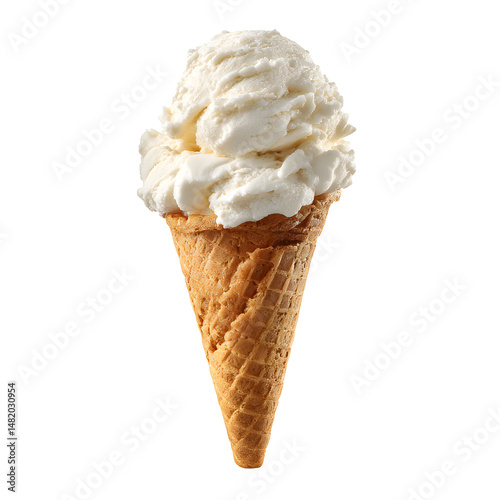 Delicious dessert with a scoop of frozen confection on a waffle cone against a dark, neutral background.