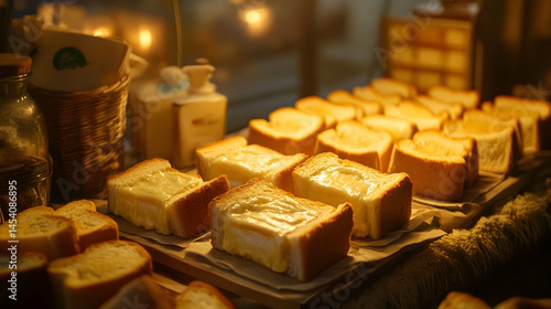 Delicious Display: Golden toasted bread with cream in a cozy bakery setting