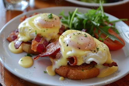 Delicious eggs benedict with bacon and hollandaise on tiger crust bread