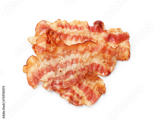Delicious fried bacon slices isolated on white, top view