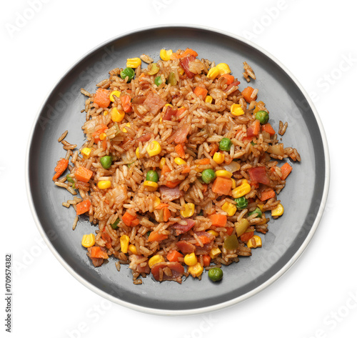 Delicious fried rice with vegetables and bacon isolated on white, top view