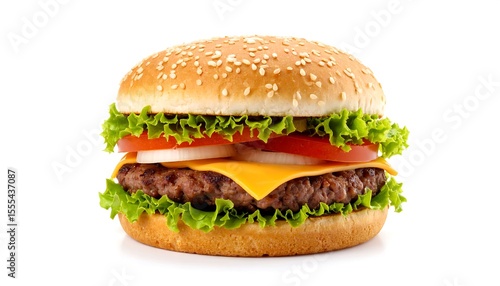 Delicious gourmet burger with cheese with tomatoes, lettuce, and onion and sesame bun on white background.