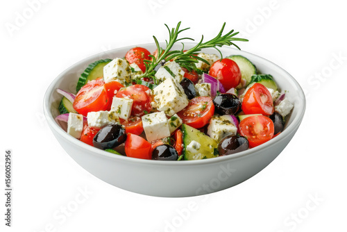 Delicious greek salad with feta cheese, tomatoes, cucumbers, and olives in white bowl, healthy eating and fresh ingredients isolated on transparent background