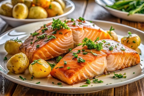 Delicious Grilled Salmon Fillets with Roasted Potatoes - Isolated on White Background