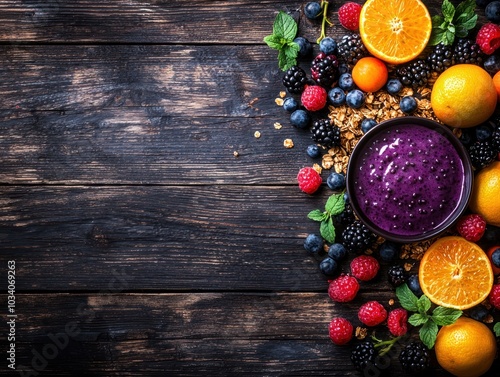 Delicious healthy smoothie bowl surrounded by fresh fruits and crunchy granola on rustic wooden background