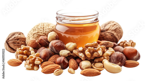Delicious Honey Jar Surrounded by Assorted Nuts Almonds Hazelnuts Walnuts Healthy Snack Still Life