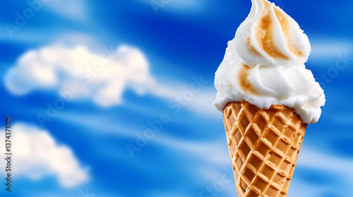 Delicious ice cream cone against a blue sky with fluffy clouds on a sunny day