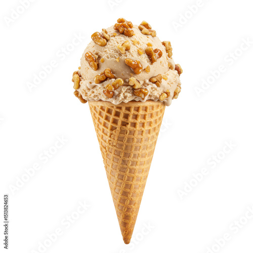 Delicious ice cream cone topped with crunchy nuts against a plain background (2)