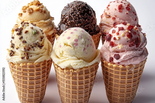 Delicious ice cream cones with assorted toppings: a tempting display of colorful frozen treats