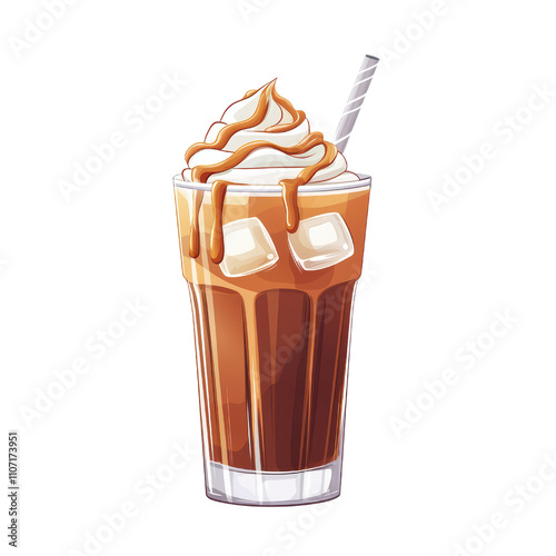 Delicious iced coffee topped with whipped cream and caramel drizzle, served in tall glass with ice cubes and straw. Perfect for refreshing treat! isolated on transparent background