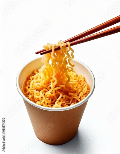 Delicious instant noodles being lifted with chopsticks from a takeout cup.