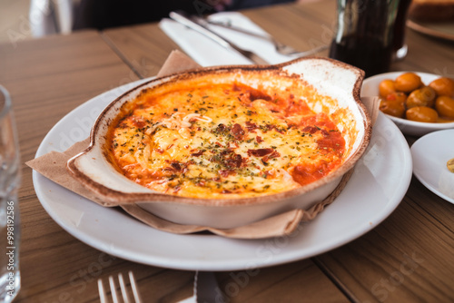 Delicious italian provolone baked with tomato sauce and oregano with slices of toast bread.