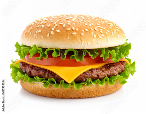 Delicious Juicy Hamburger with Lettuce Tomato and Cheese Isolated on White Background