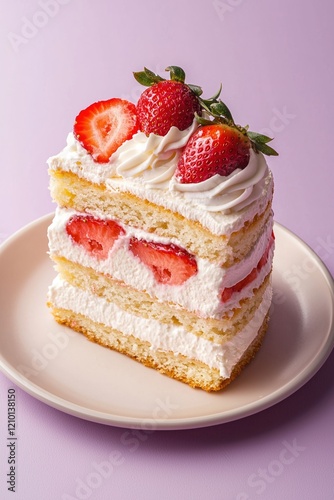 Delicious layers of strawberry shortcake served on a smooth plate against a muted lavender background