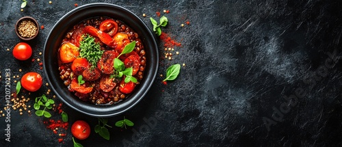 Delicious Lentil Stew with Tomatoes and Herbs Dark Rustic Background