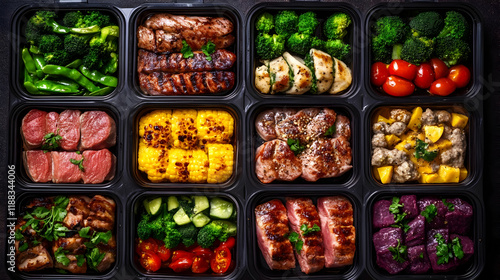 Delicious Meal Prep Containers Filled with Various Grilled Meats and Vegetables in a Balanced Diet