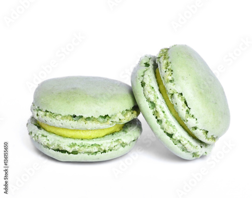 Delicious multicolored macaroons, isolated on white background. Studio isolated pistachio macaroon candy.