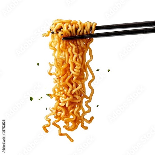 Delicious noodles held with chopsticks on transparent background, PNG format.