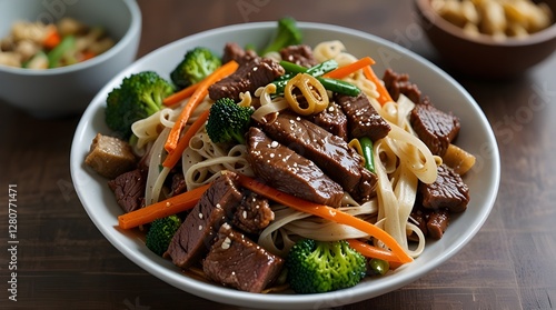 Delicious Pad See Ew featuring tender beef, colorful vegetables, and flavorful noodles, beautifully presented in minimalist design. Perfect for food lovers. generative.ai
