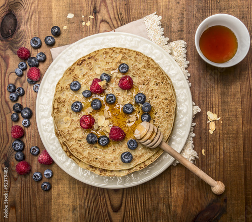 delicious pancakes with fresh berries with honey, almonds cup of tea with honey spoon on white plate with napkin on wooden rustic background top view