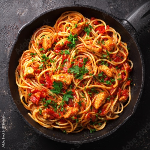 Delicious pasta with tomato sauce and chicken in a pan, ready to be served