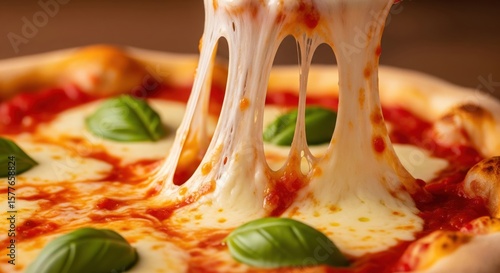 Delicious Pizza with Pulling Cheese. A close-up of a delicious pizza with a thick crust, a rich tomato sauce, melted cheese, and fresh basil leaves. The cheese is being pulled, creating a stringy