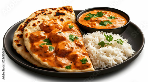 Delicious plate of butter chicken with rice and naan, garnished with fresh cilantro for an appetizing presentation.