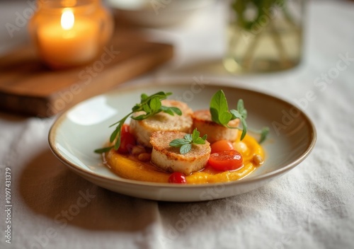 Delicious plated dish with scallops, cherry tomatoes, and puree on a cozy dining table