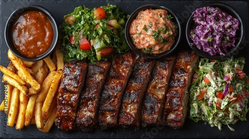 Delicious platter of grilled ribs with sides of fresh salads, sauces, and crispy fries on a slate board