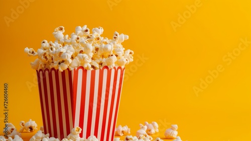 Delicious popcorn scattering from a red striped carton box on a bright background with copy space