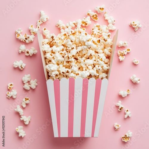 Delicious Popcorn Spilling From a Whimsical Striped Container Against a Playful Pink Backdrop Creating a Fun Movie Snack Moment