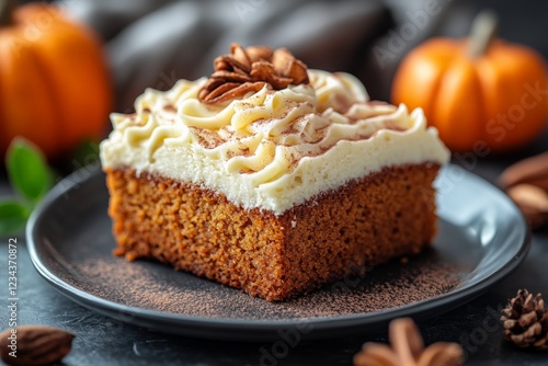 Delicious pumpkin spice cake topped with creamy frosting and nuts served on a dark plate with autumn decorations
