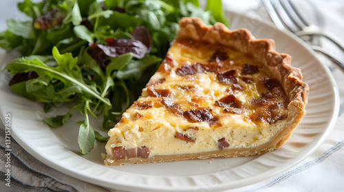 Delicious Quiche Lorraine with Crispy Bacon and Fresh Greens on a White Plate