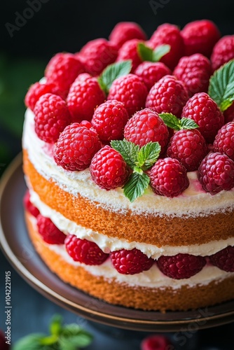 Delicious raspberry cake topped with fresh berries and mint, perfect for any celebration