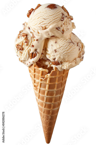 Delicious scoop of caramel pecan ice cream in a waffle cone. Perfect dessert for a summer day, transparent background