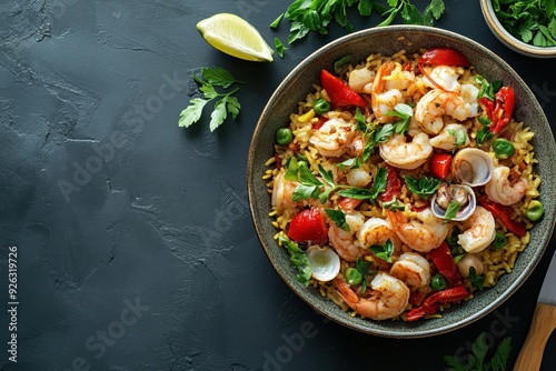Delicious seafood paella with shellfish and saffron rice, placed on the right side of a dark stone table. Professional overhead shot highlighting the vibrant and flavorful dish.