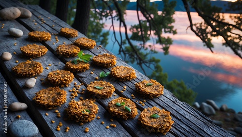 Delicious Seed Cookies on Wooden Table with Scenic Lake View